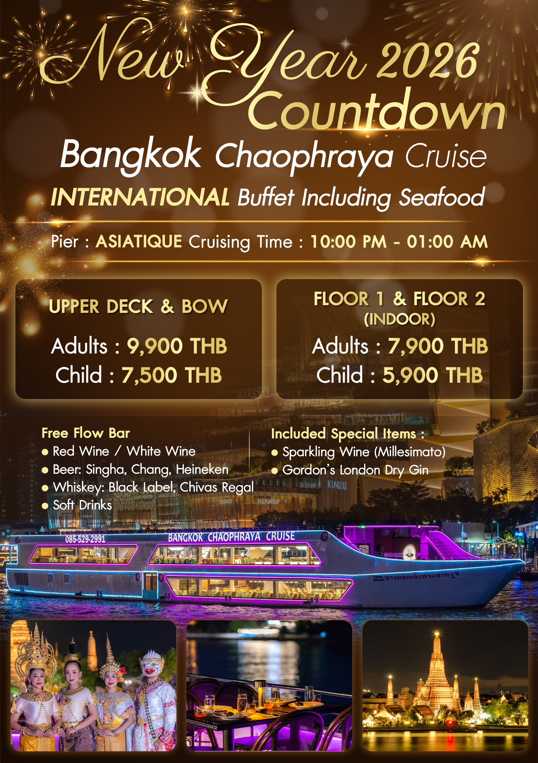 Welcome aboard the Chaophraya river night cruise... During this fabulous riverboat ride, you will spend an exciting and memorable 2-hour evening from 8:00 to 10:00 p.m. cruising and dining along the Chaophraya River. This river is Bangkok’s main river which stretches all the way from China to the Gulf of Thailand. Relax, enjoy the beautiful sights and dine with a fine buffet of Thai and international cuisine in the enchanting and magical atmosphere which is something you shouldn't miss. If you are looking for an evening out on the town, we are sure you will love this memorable one with us. The tranquil Chao Phraya river setting creates the perfect place to relax and enjoy excellent Thai smile service, authentic Thai and international foods, live Thai classical dance shows, live music and fabulous river scenery while relishing time spent with your special ones.